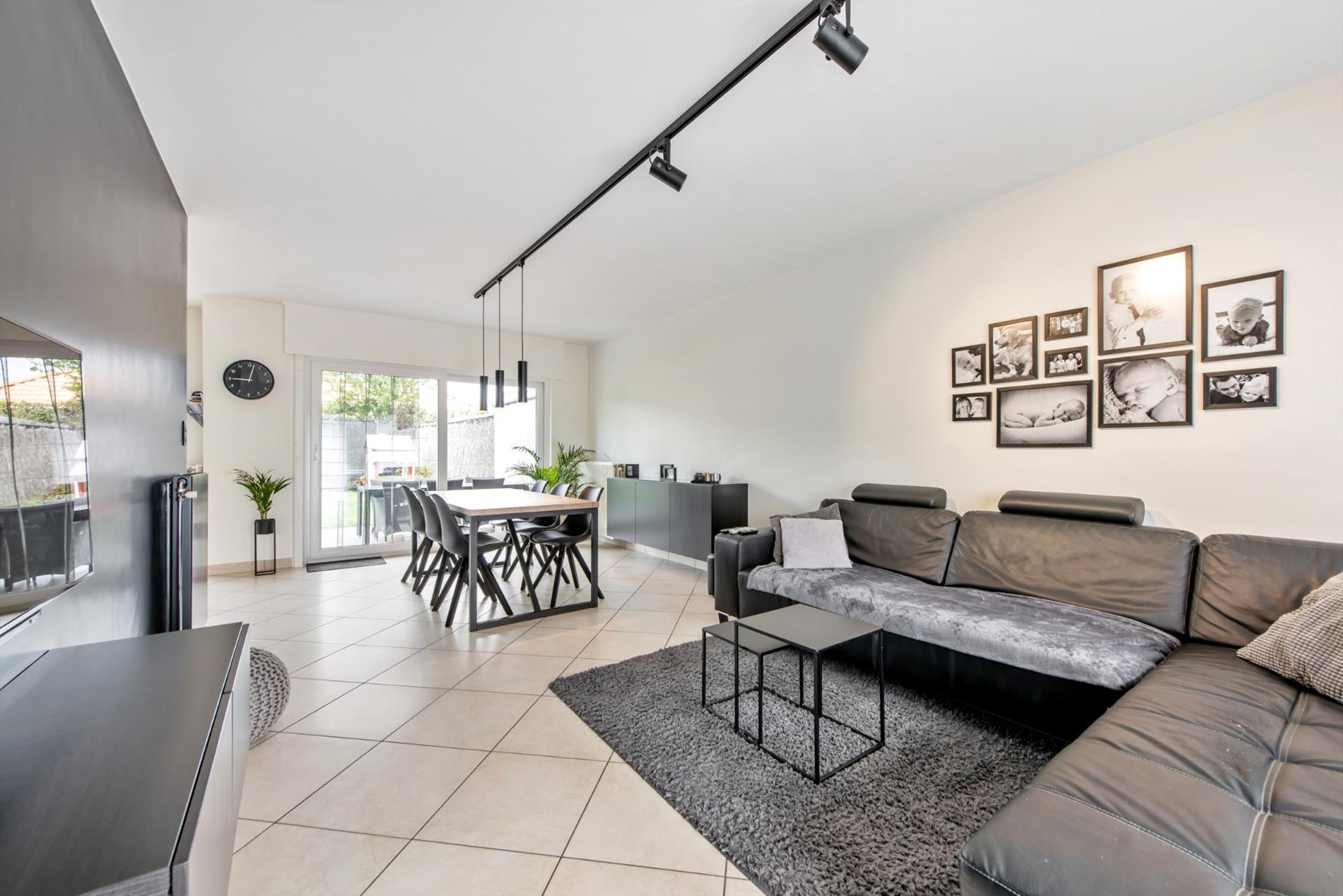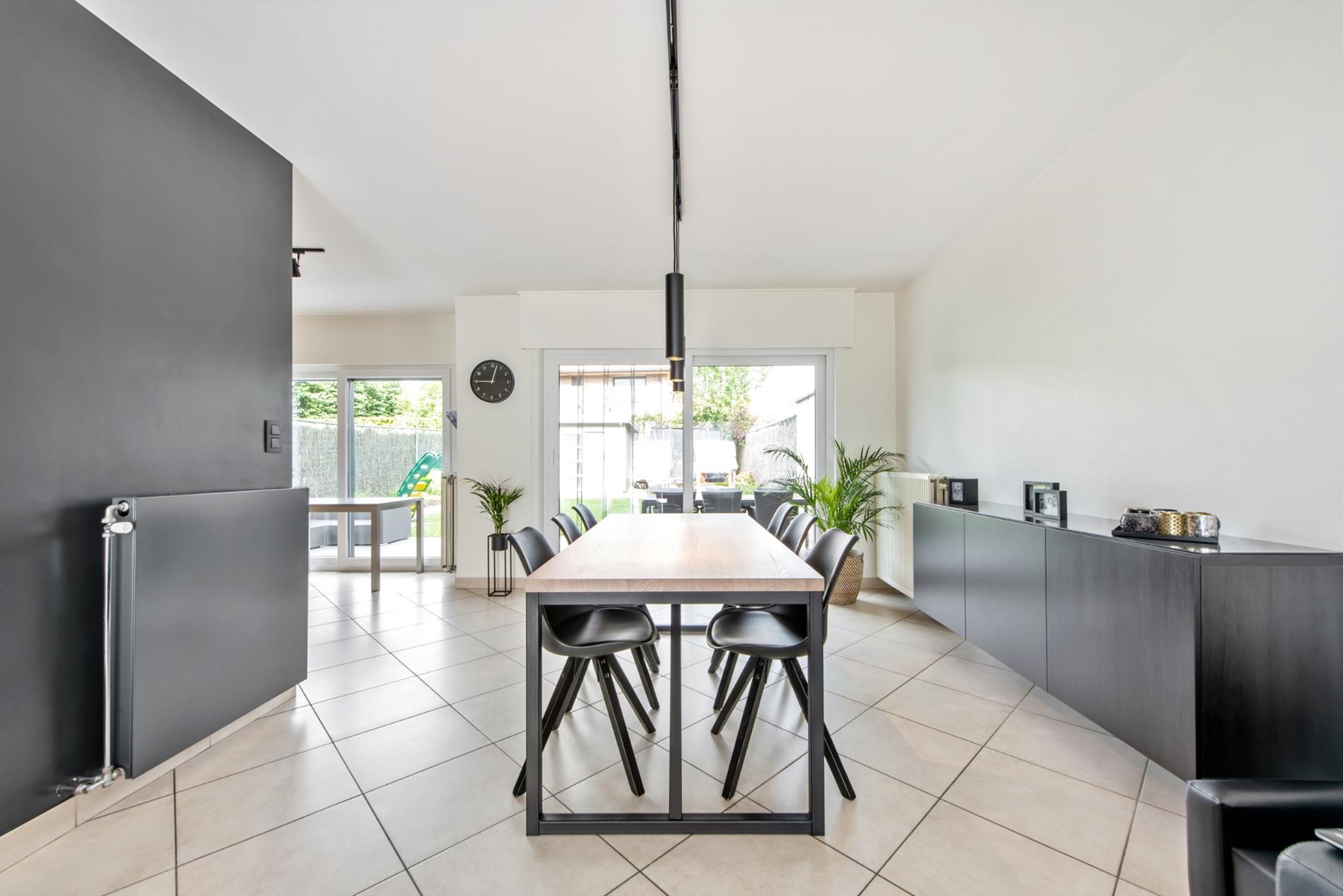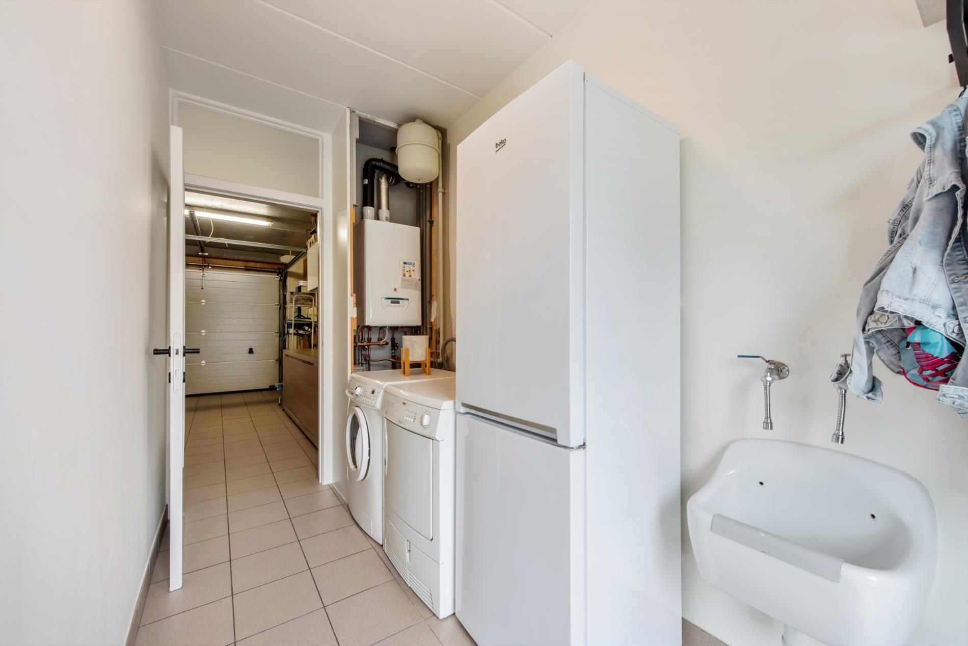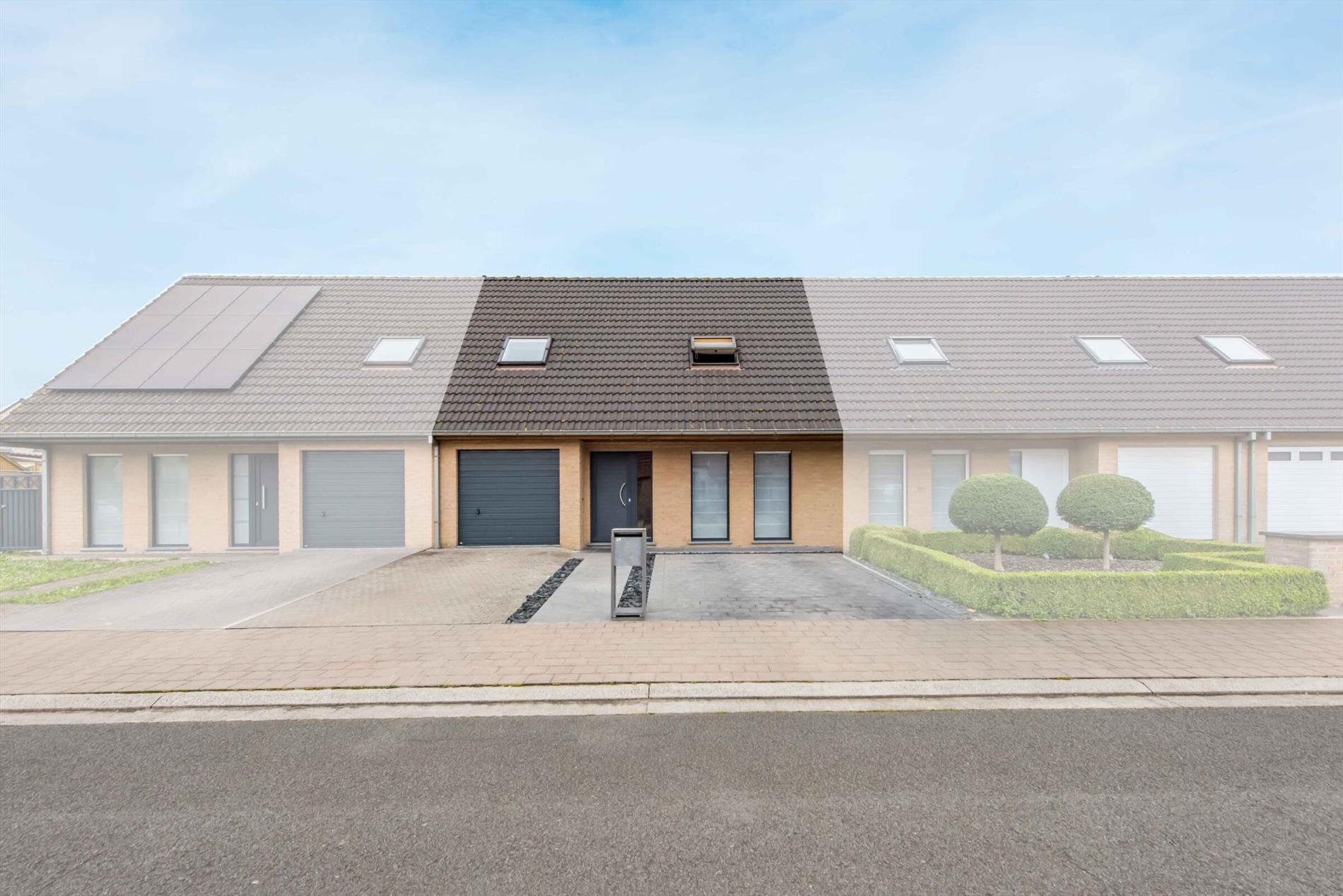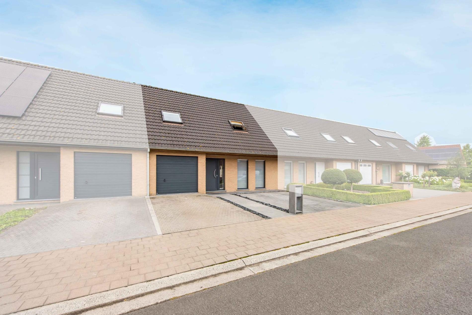 Inkomhal met gastentoilet - woonkamer met schuifraam - open ingerichte keuken met ontbijthoek en zicht op de tuin - praktische berging/wasplaats - ruime garage met extra bergruimte en geautomatiseerde garagepoort.