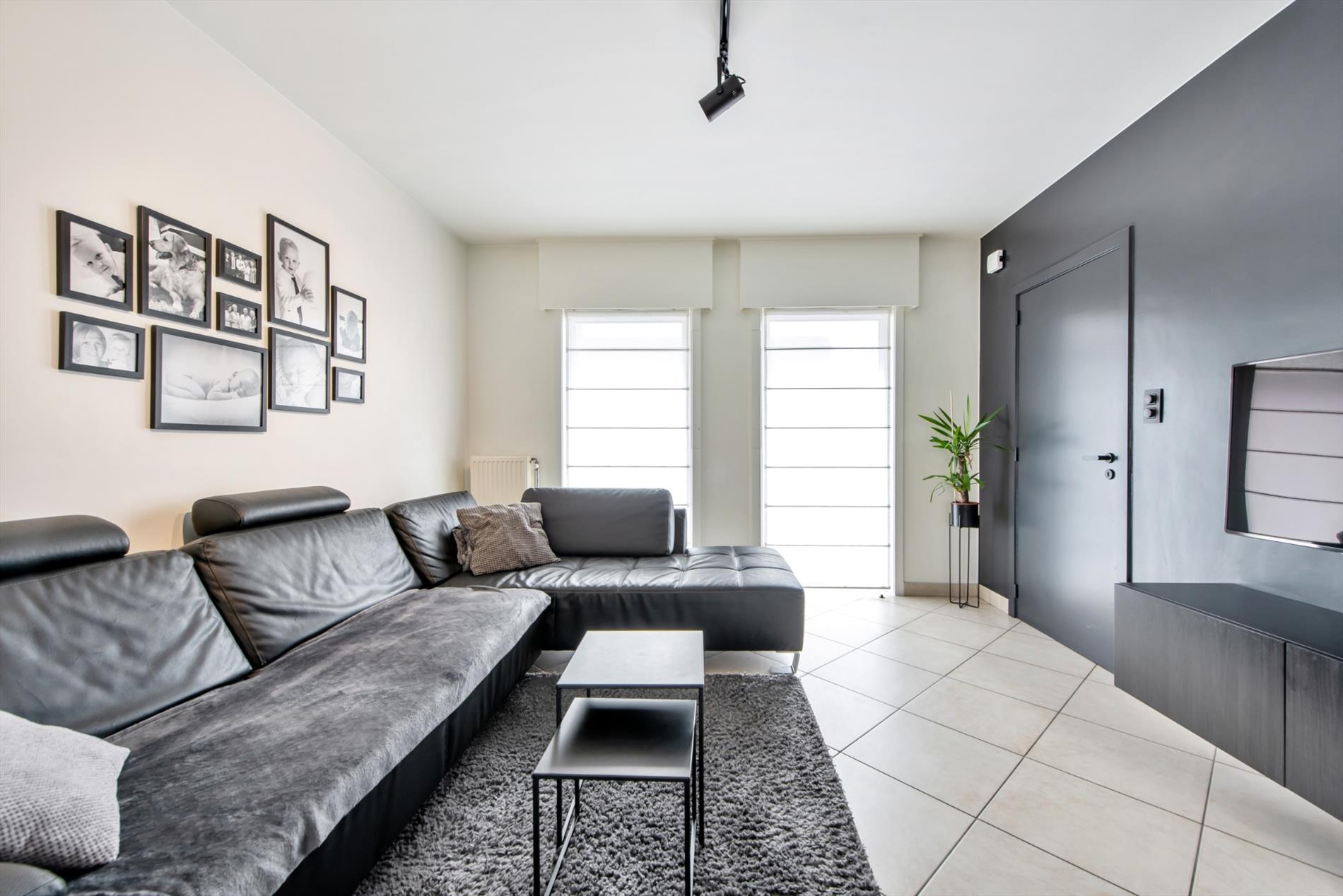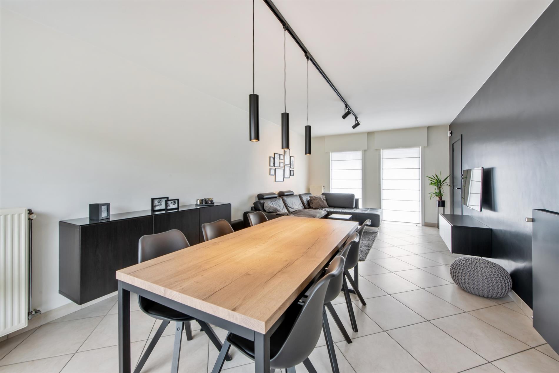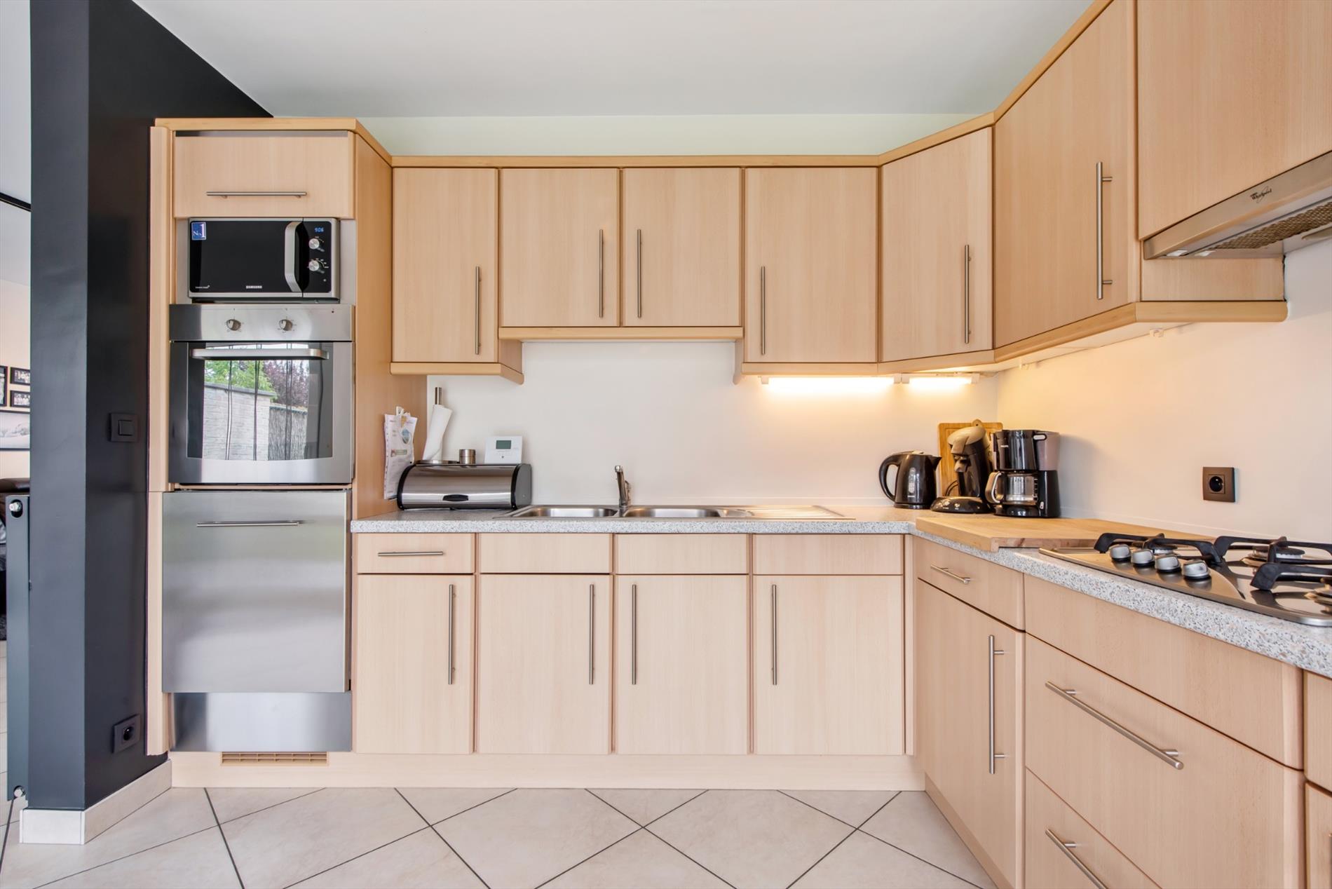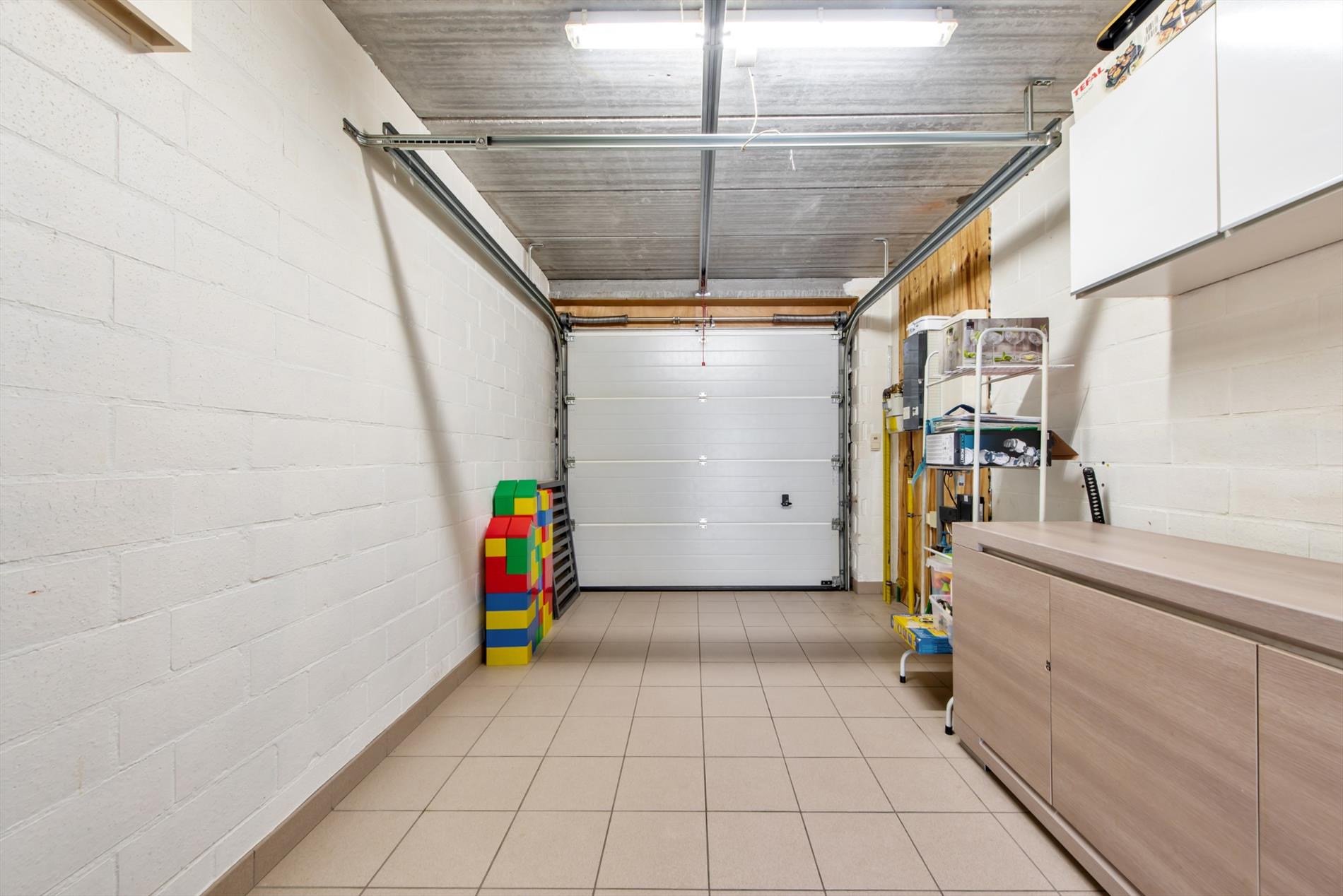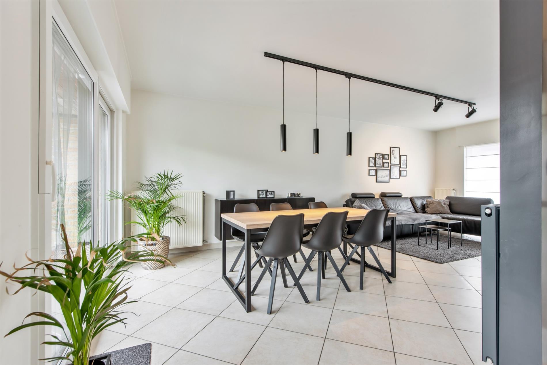 Inkomhal met gastentoilet - woonkamer met schuifraam - open ingerichte keuken met ontbijthoek en zicht op de tuin - praktische berging/wasplaats - ruime garage met extra bergruimte en geautomatiseerde garagepoort.