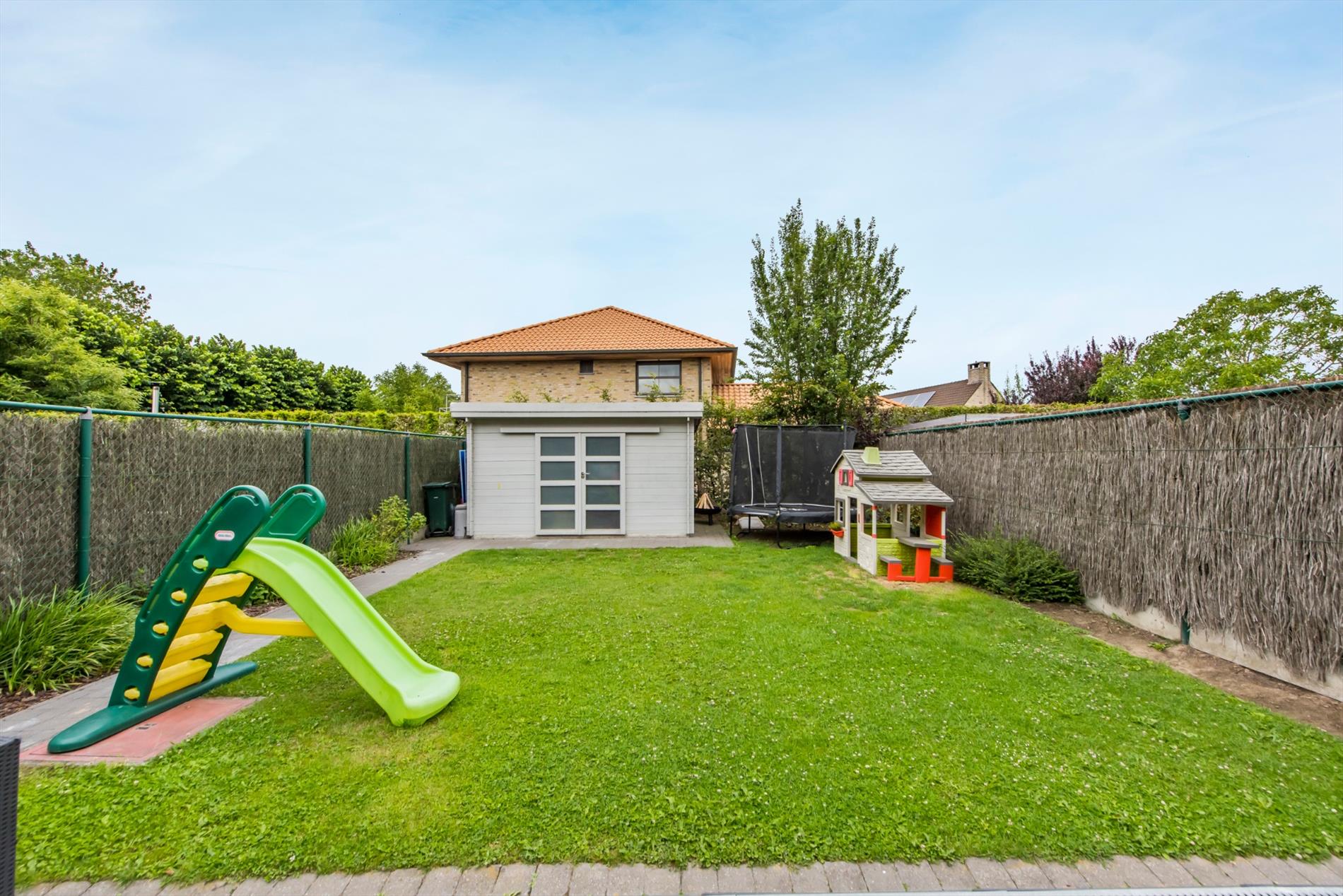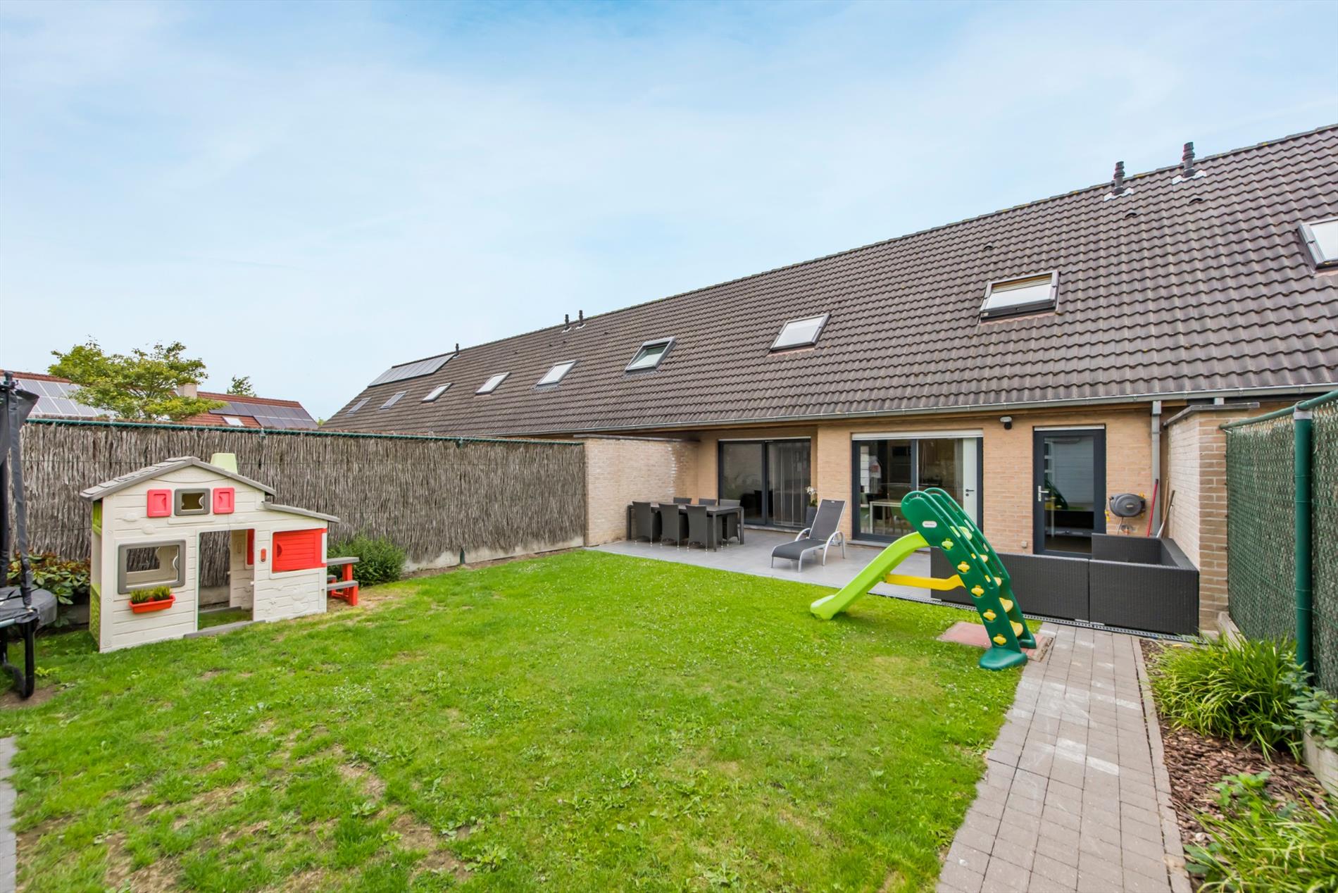 Achteraan vinden we een ZW-gerichte tuin met terras, gazon en een praktisch tuinhuis.
