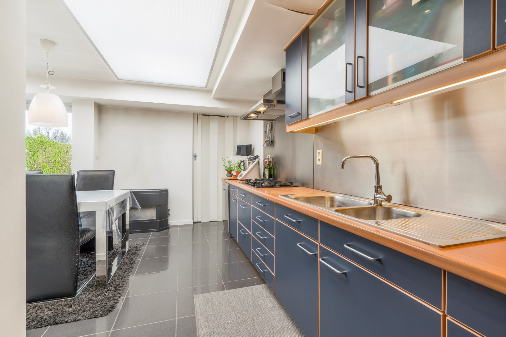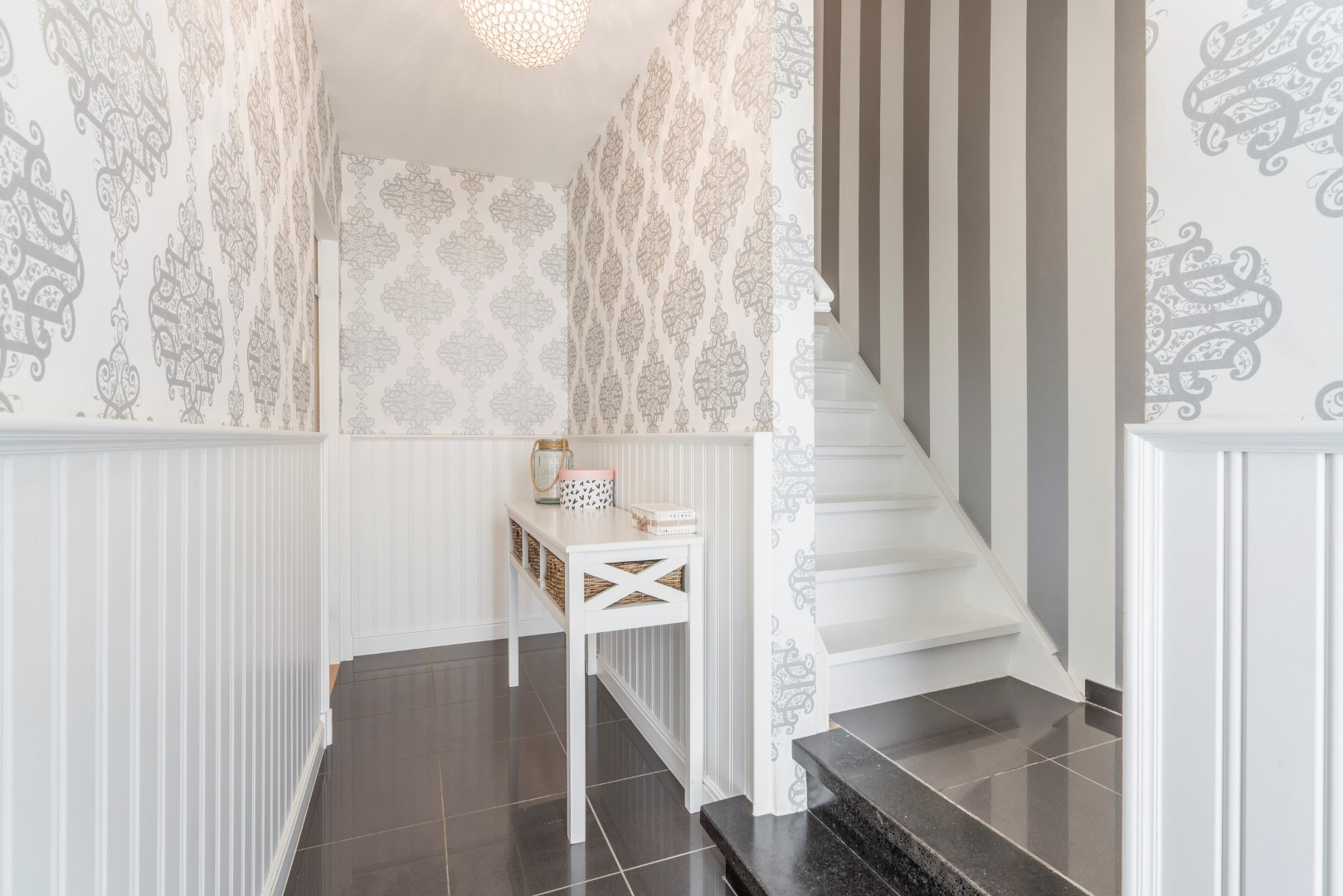 Inkomhal met trap en gastentoilet, woonkamer met toegang tot de aanpalende uitbouw met onder meer de ingerichte keuken en ruime eetplaats.
