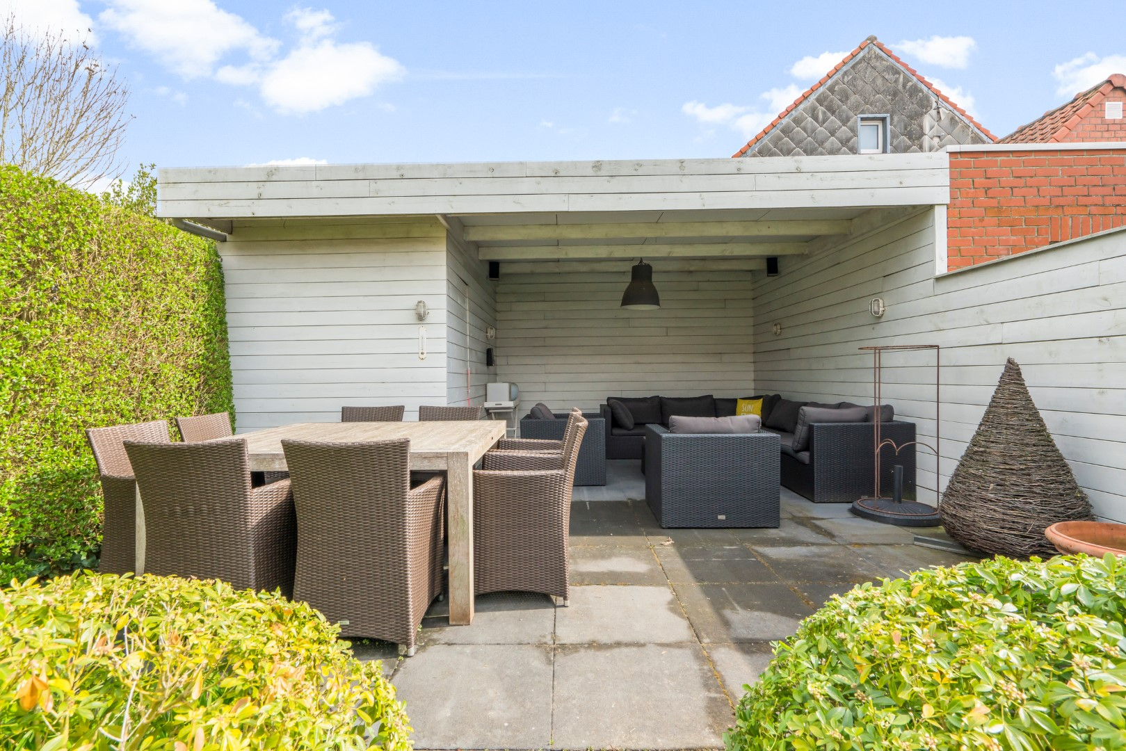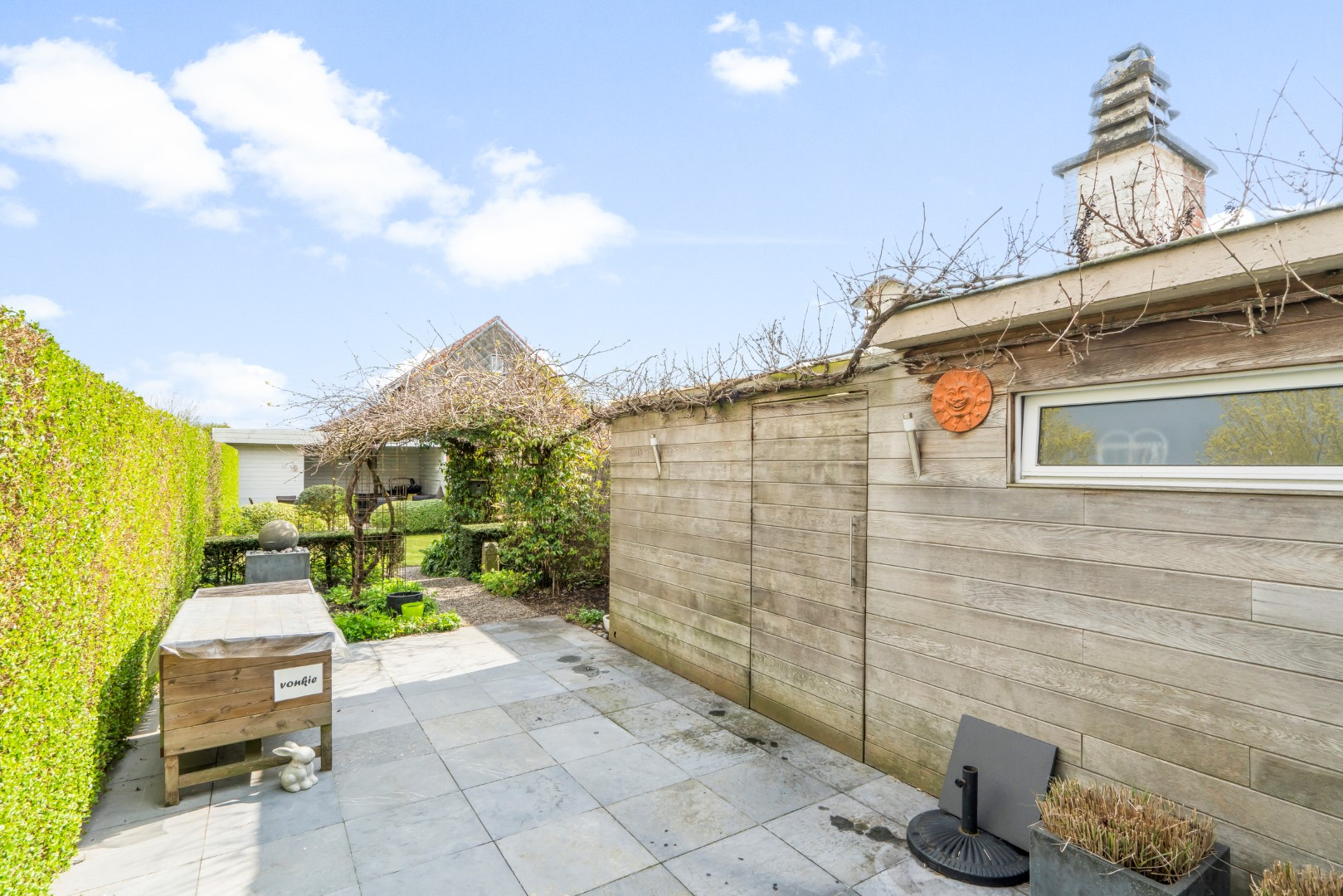 Er is een mooi ingerichte tuin met gazon, diverse ... aanplantingen, terras (40m²) , tuinberging en achteraan het perceel een gezellig overdekt terras (16 m², met 9 m² berging) waar het s'avonds heerlijk genieten is van de avondzon.
