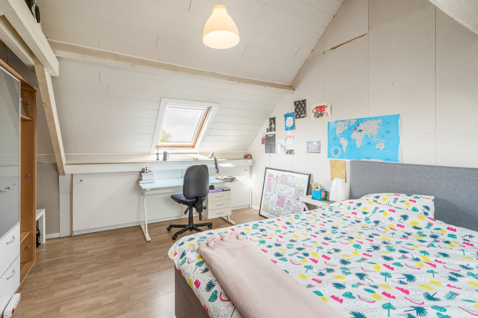 Een vaste trap biedt toegang tot de dakverdieping die ingedeeld werd tot een handige opbergruimte en ruime slaapkamer.
