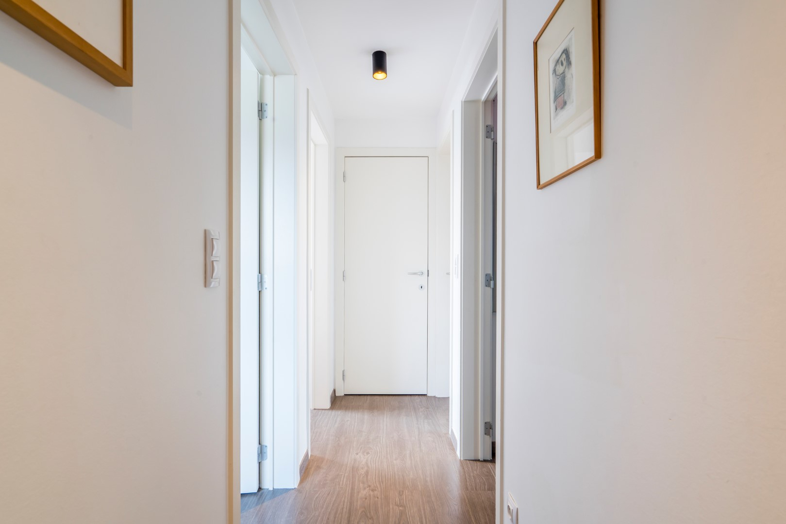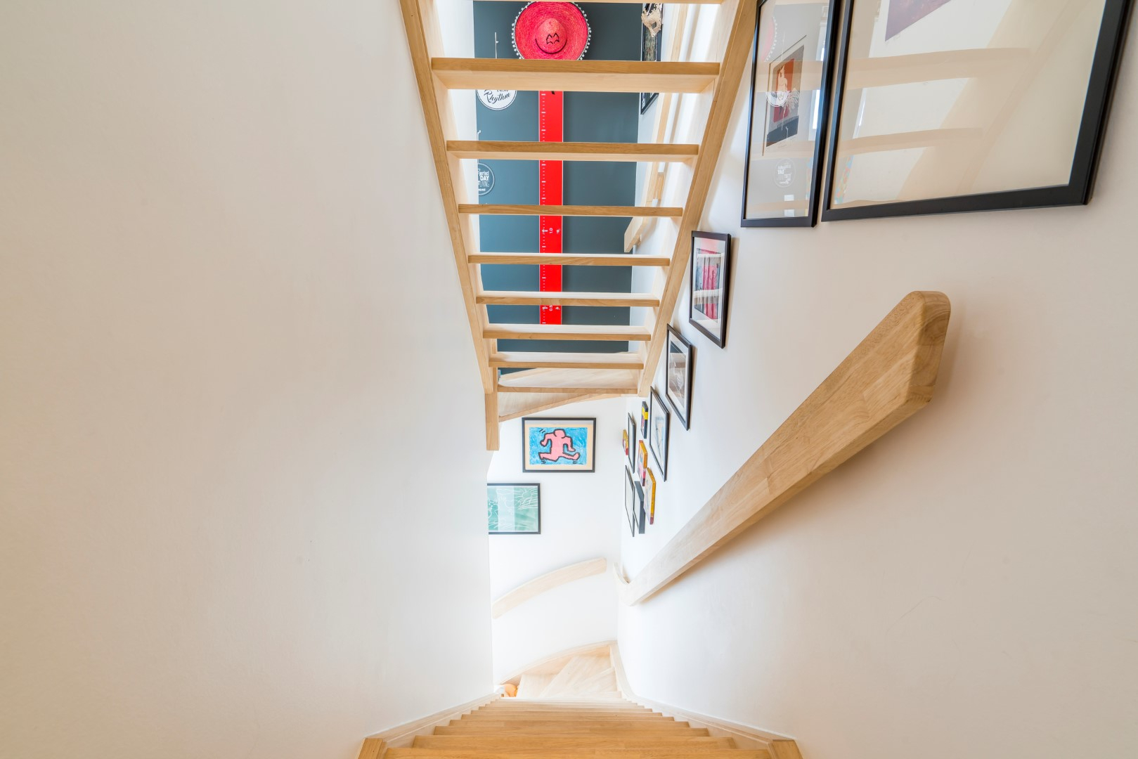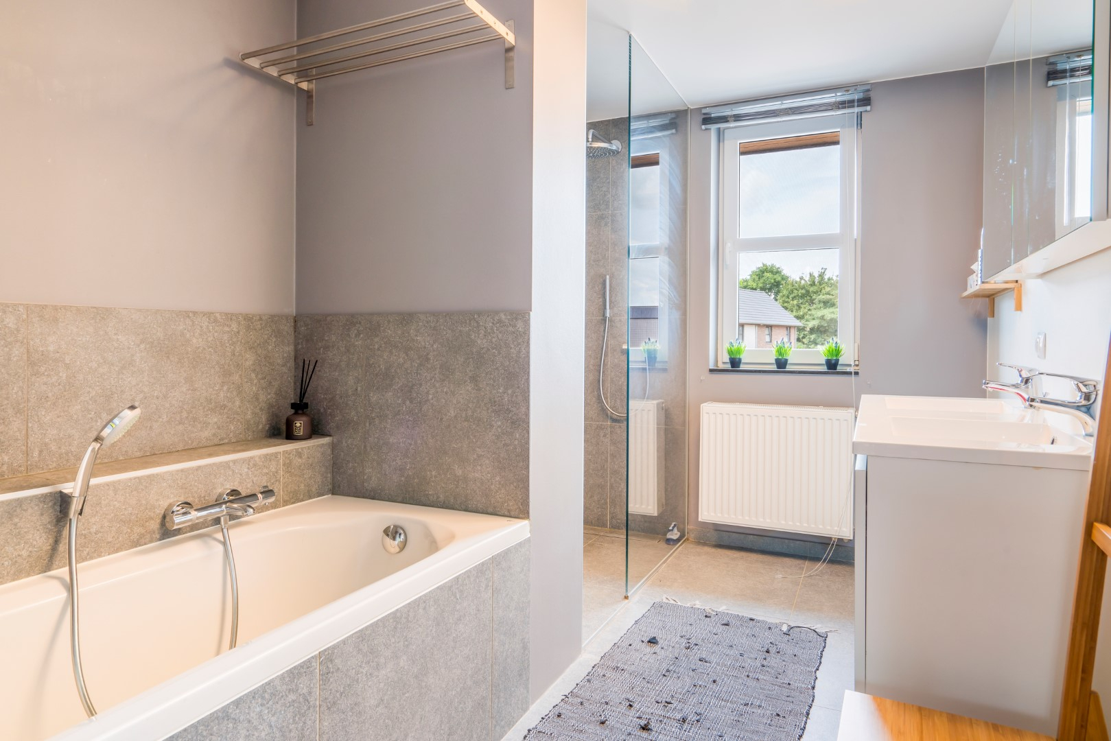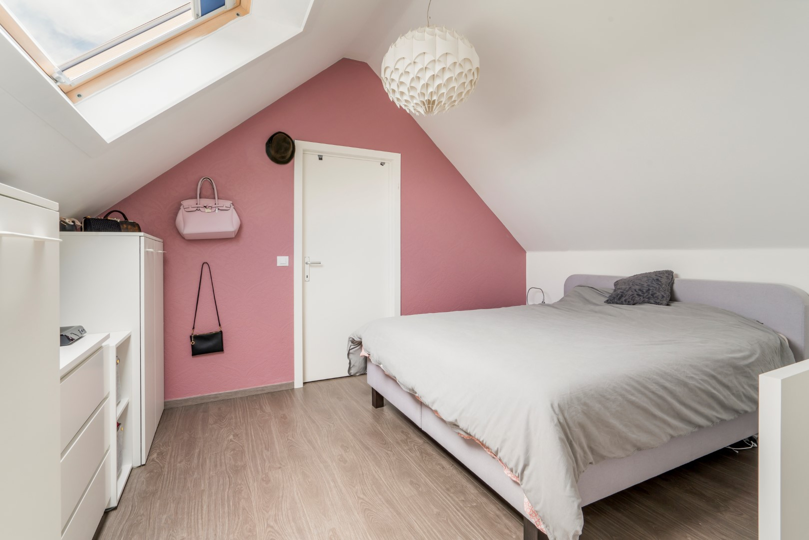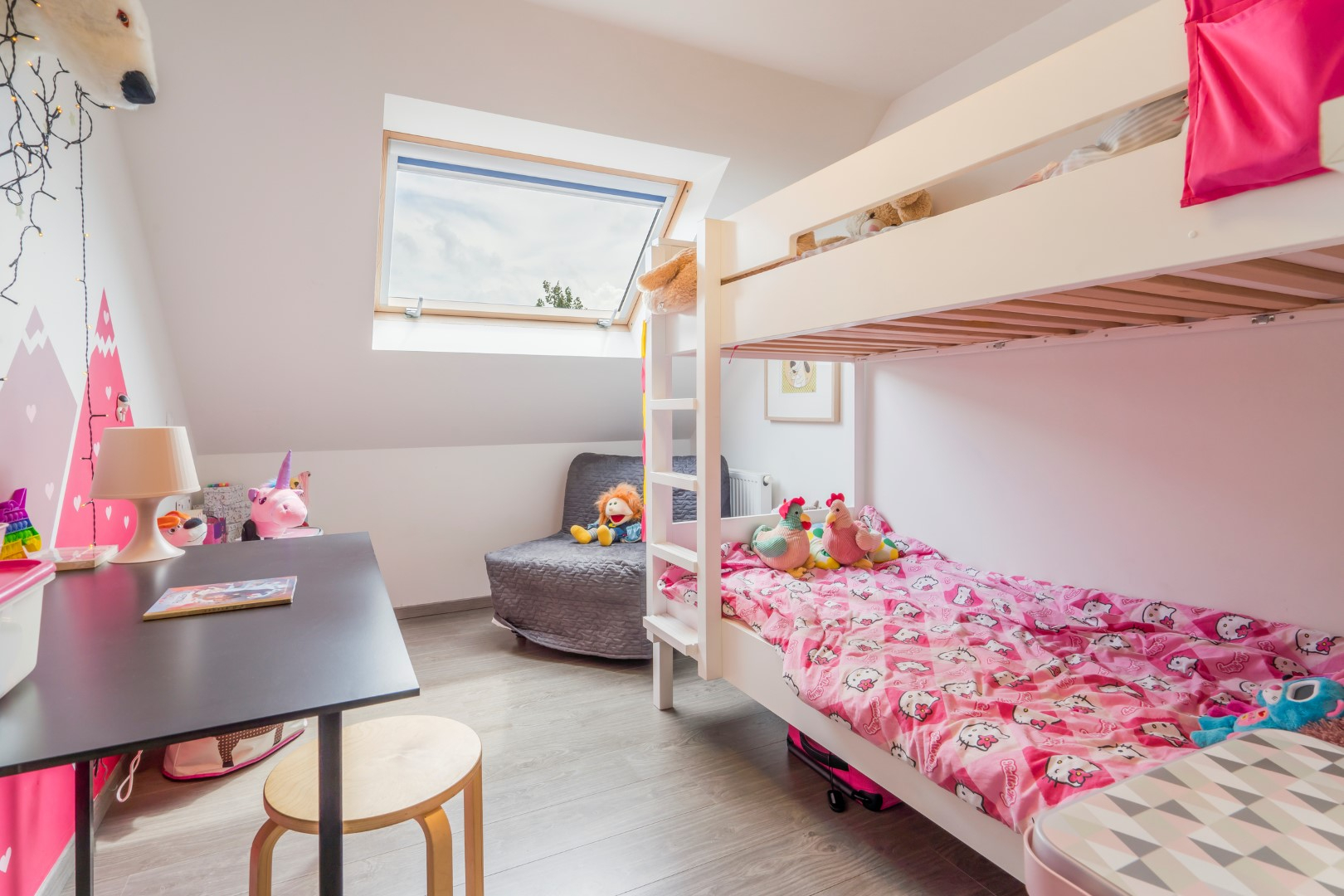 De verdieping omvat de nachthal met twee leuke slaapkamers, toilet, ruime badkamer (ligbad én inloopdouche) en een doorloopkamer dat dienst doet als dressing.