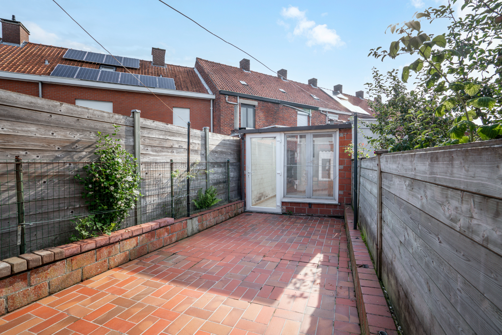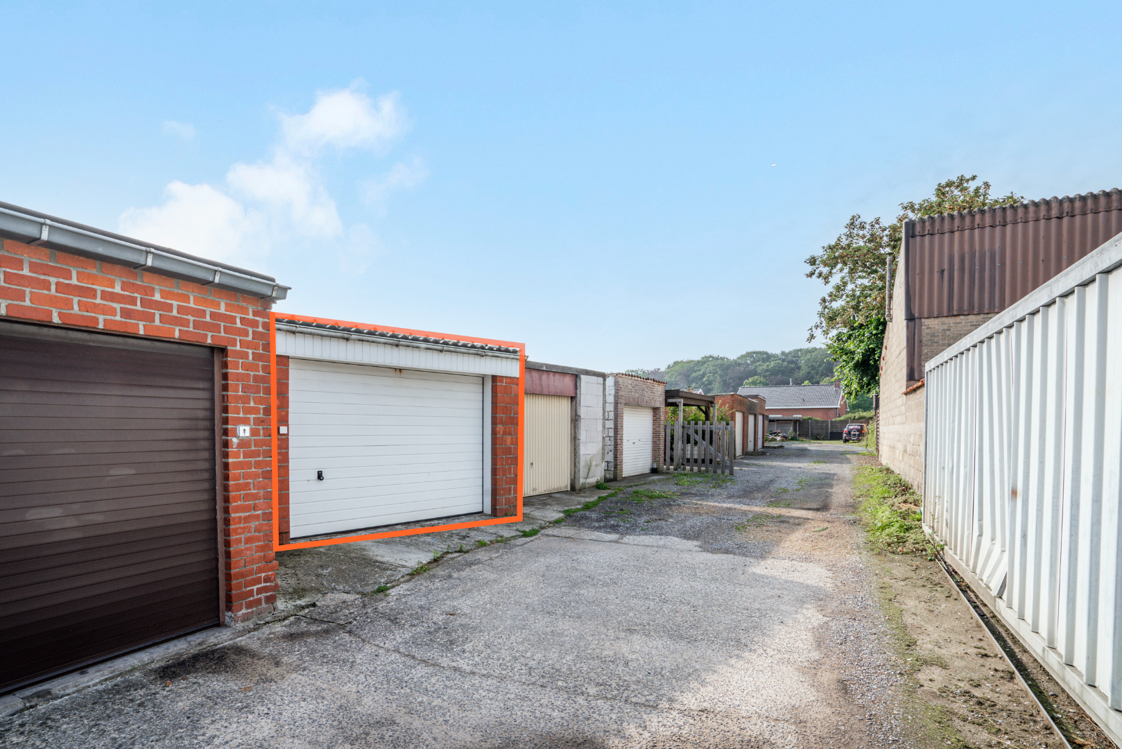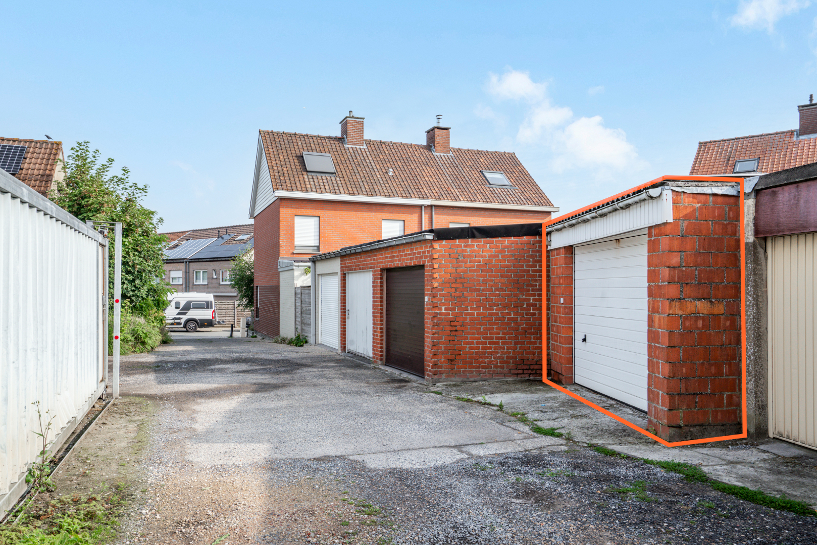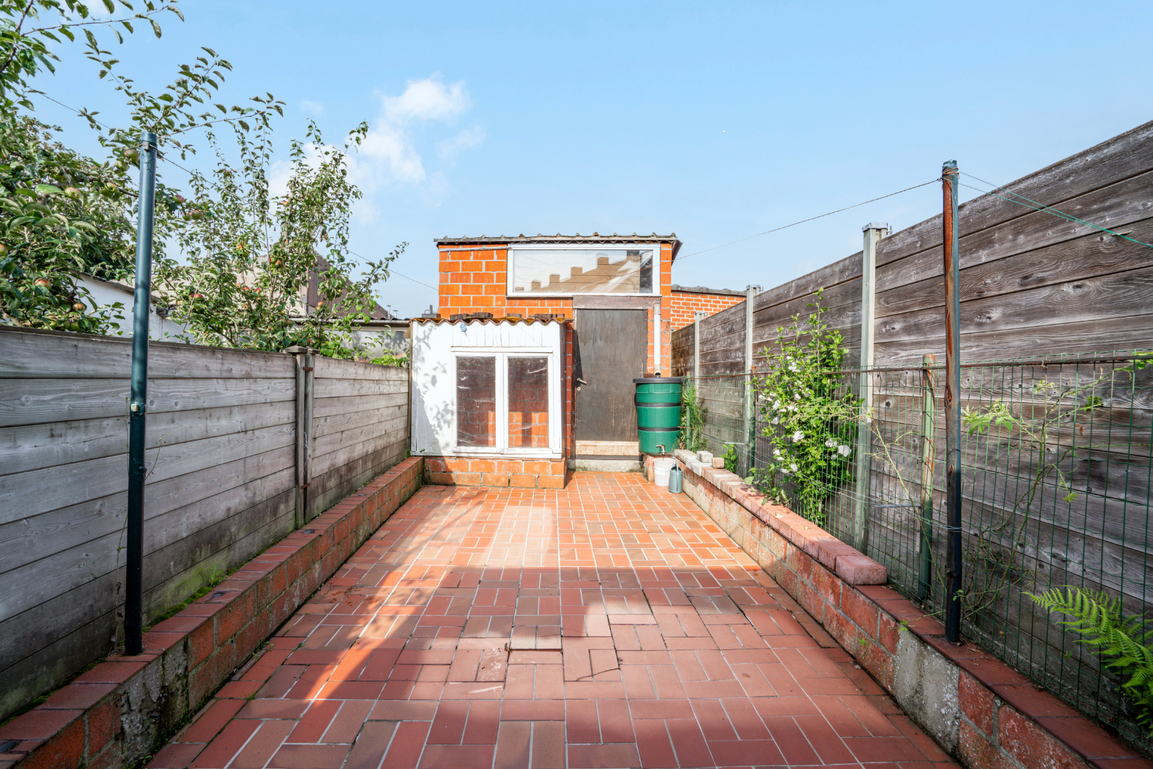 EXTERIEUR: voortuin - koer/terras achteraan met zonoriëntatie (Z-W) - ruime garagebox (30m²) met elektrische poort (uitweg naar Staakmolenstraat)