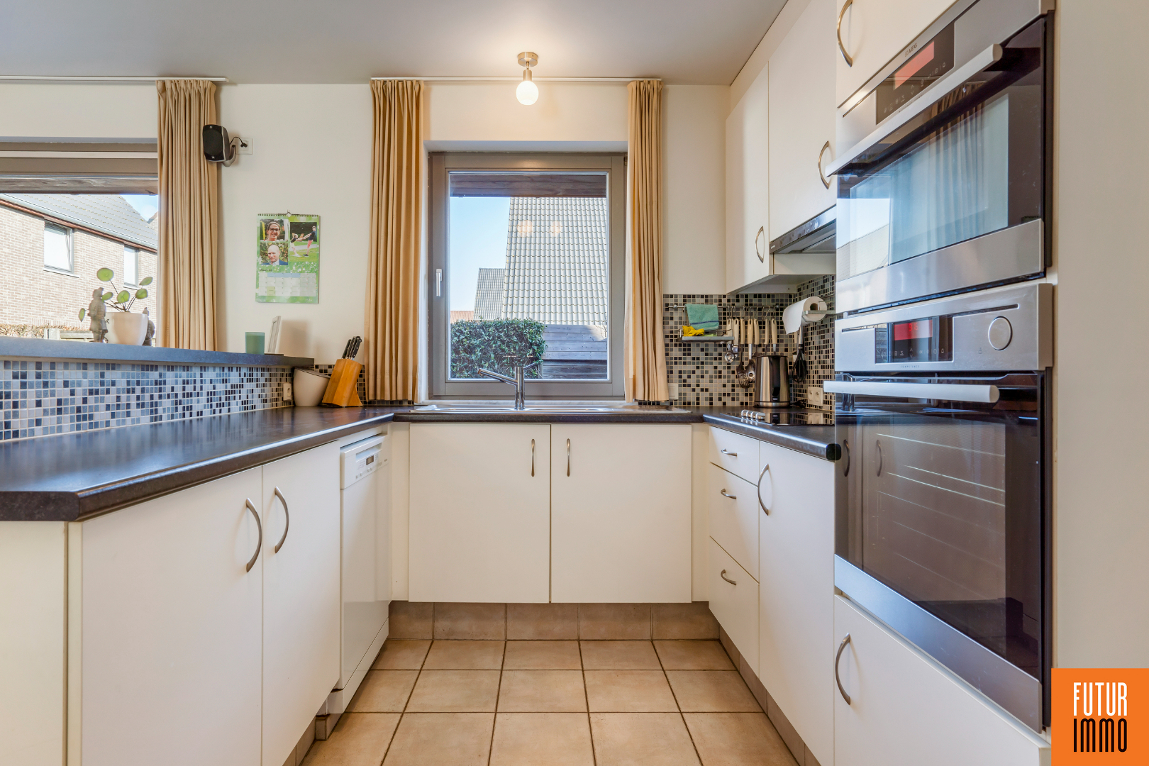 Gelijkvloers: inkomhal - toilet - zeer ruime leefruimte met zithoek en eetplaats - open keuken (met oa. 2 combi-ovens en een aantal vernieuwde toestellen) - praktische berging aan keuken - ruime garage (automatische poort) met wasplaats - zeer gezellig terras met buitenberging en 100% privacy (ook altijd de zon op terras)