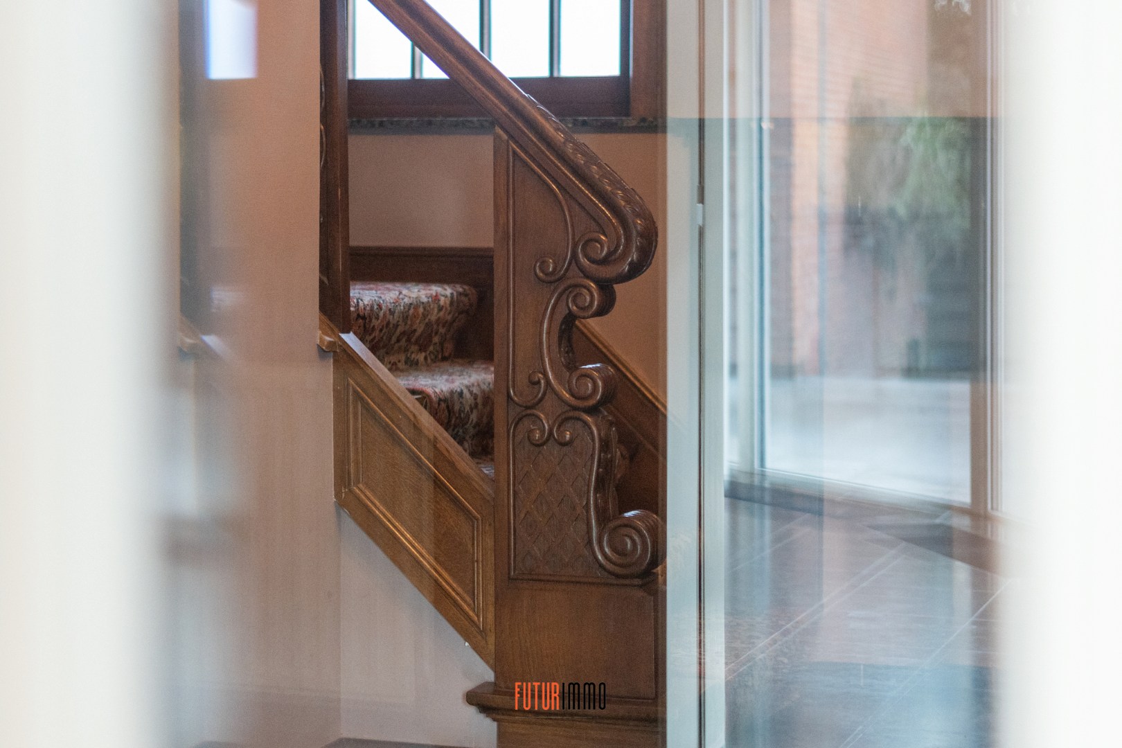 ruime inkomhal met prachtige trap - gastentoilet - berging (of bureau) - XL woonkamer bestaande uit 2 ruimtes - originele Obumex keuken met toestellen - wasplaats/bijkeuken.