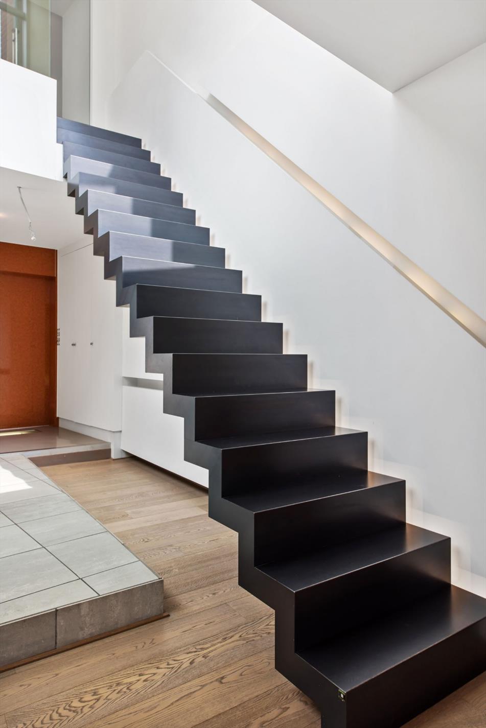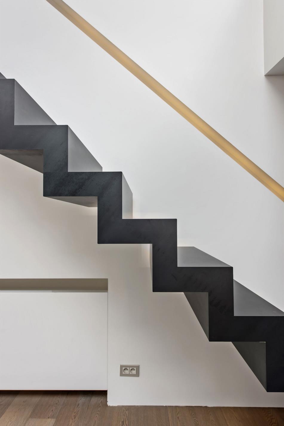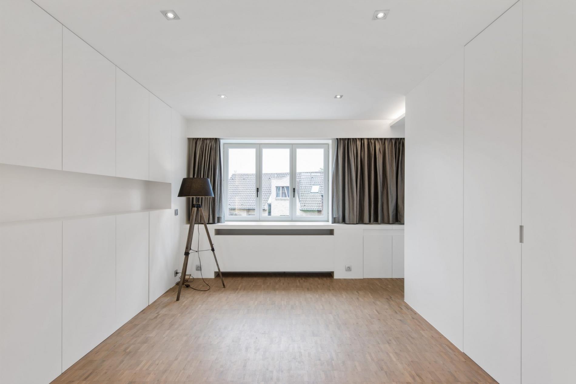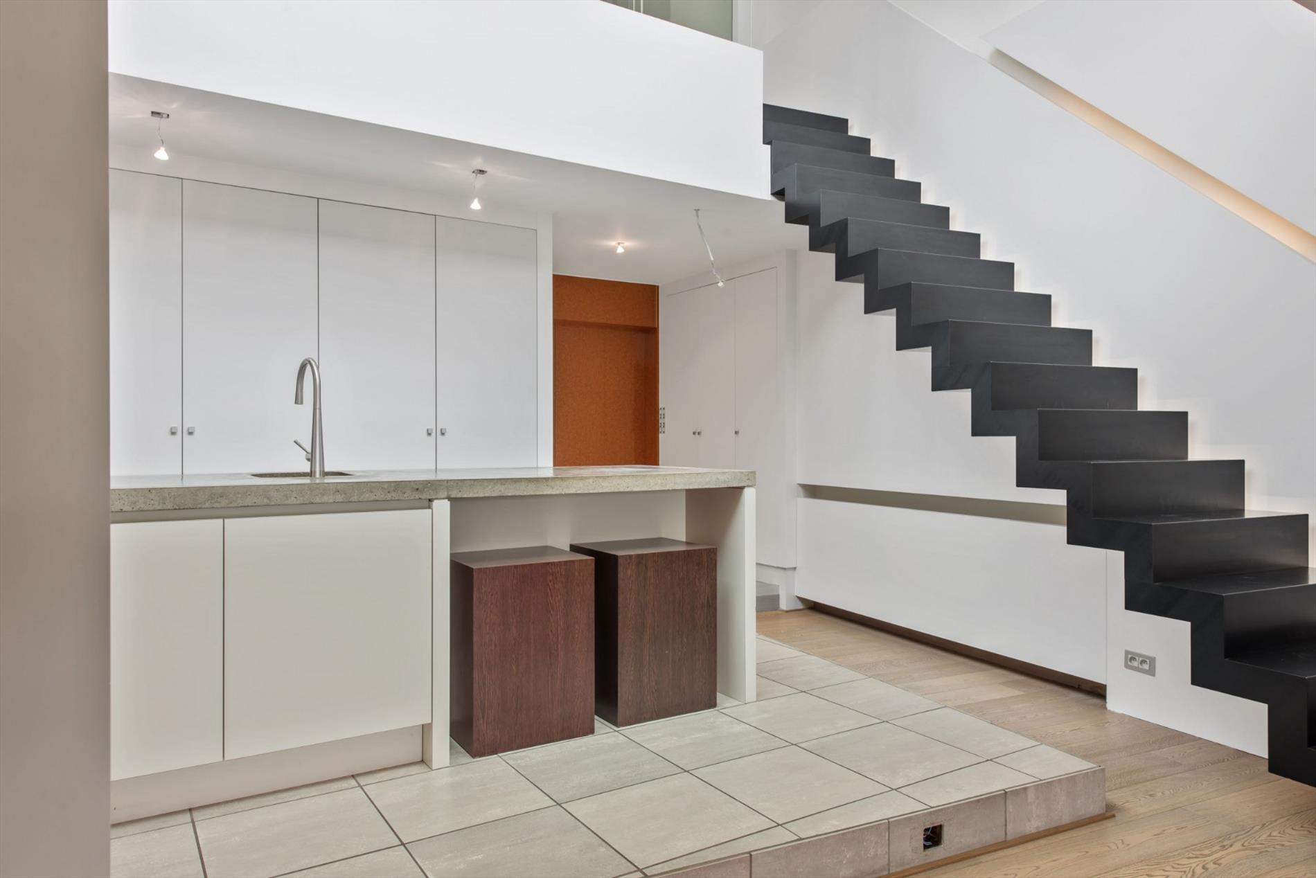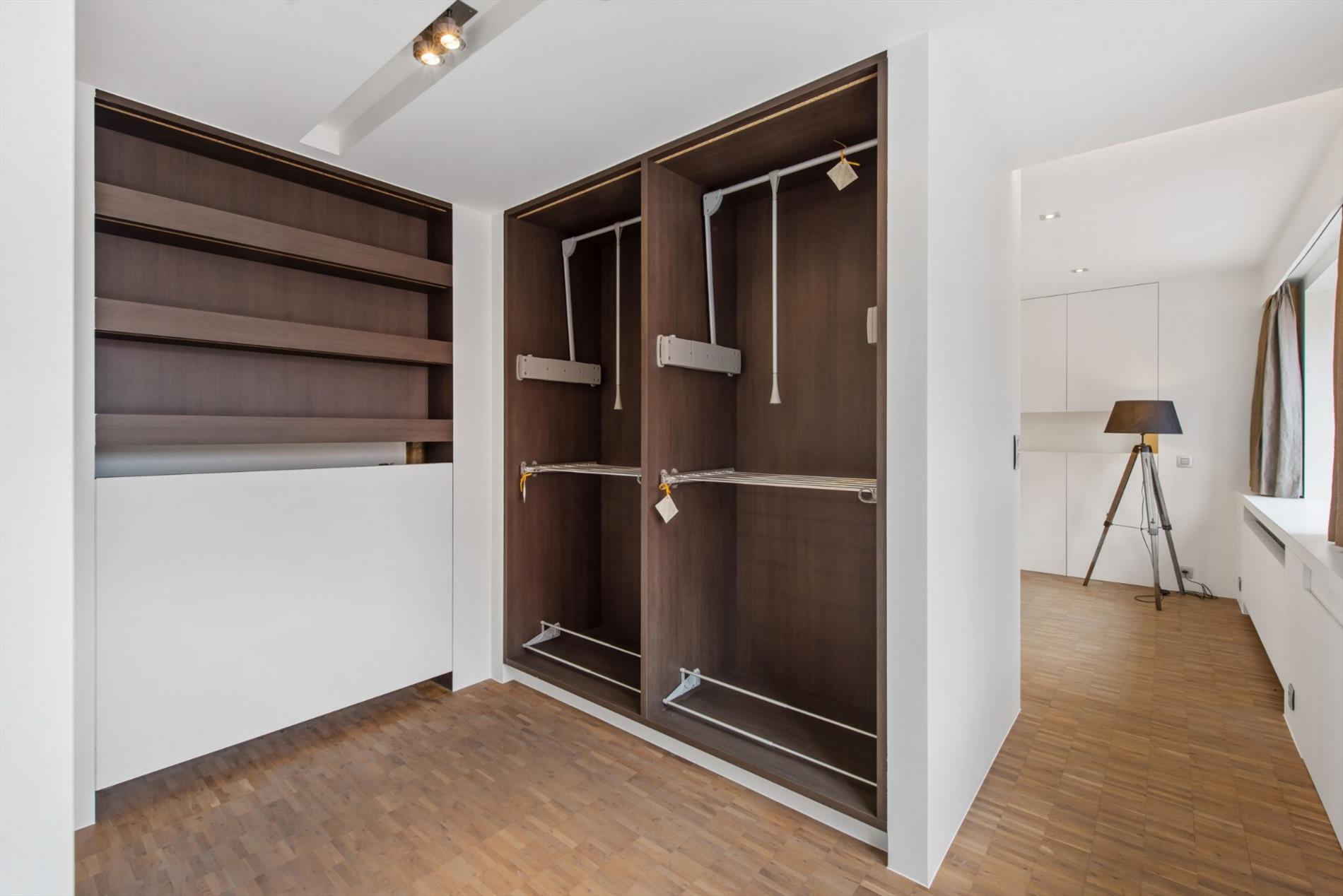 De moderne trap is een echte eyecatcher en brengt ons naar de eerste verdieping, omvattende een open hal, een bureau/slaapkamer (voorzien van kasten) en de master bedroom met sfeervolle zitruimte (open haard & opbergkasten) en dressing.