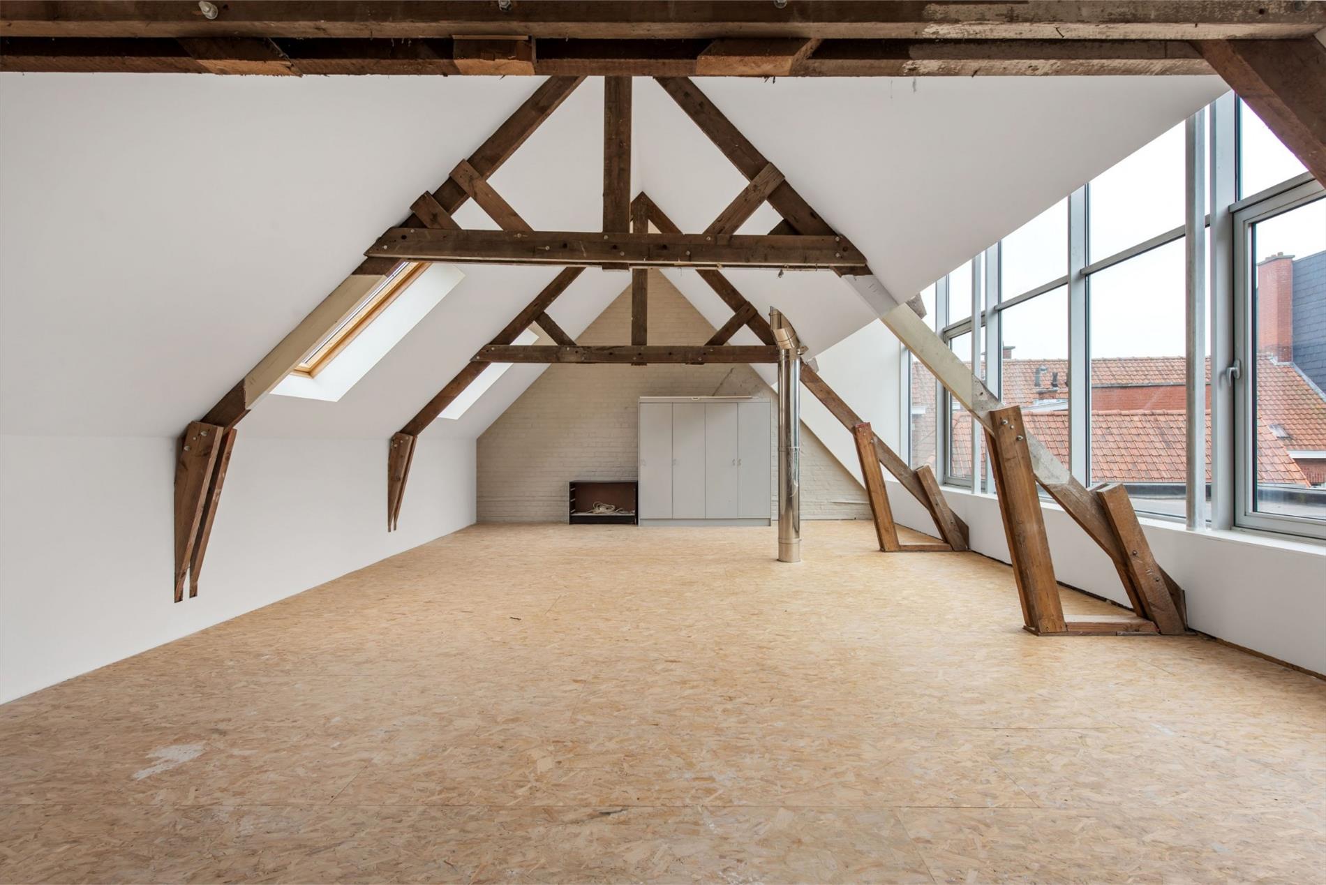 Achter een verborgen deur bevindt zich een tweede hal met afzonderlijk toilet en badkamer (beide nog te vernieuwen). Vanuit deze hal is er een vaste trap naar de ruime dakverdieping, ... voorzien van vele raampartijen. (uniek zicht op het Kerkplein).