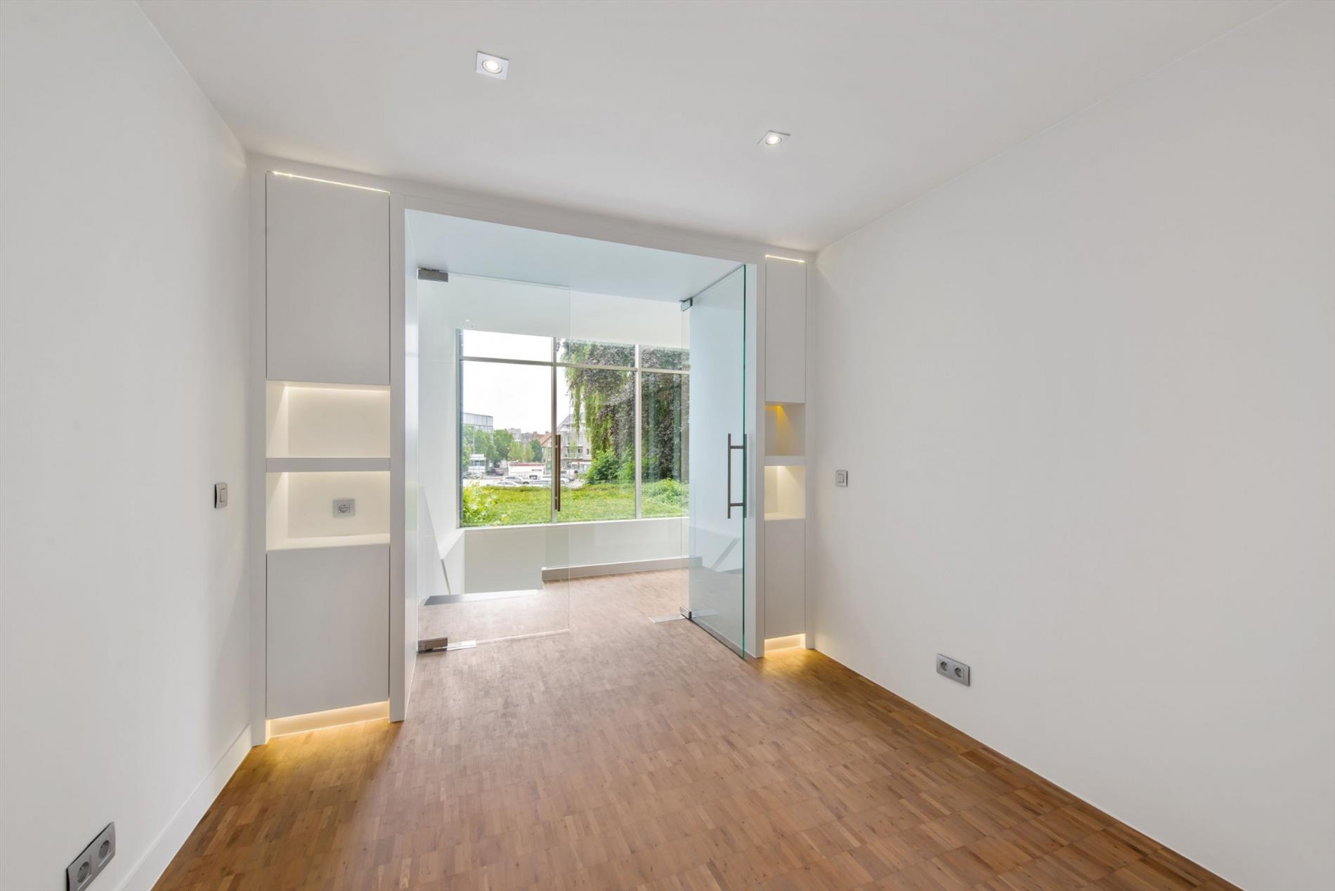 Deze geeft toegang tot een praktijkruimte (of polyvalente ruimte) en toilet. Via een tweede voordeur begeven we ons tot de ruime living met moderne open keuken en aanpalend een handige berging/wasplaats.