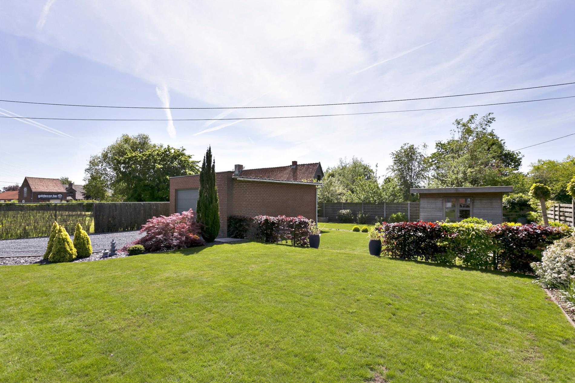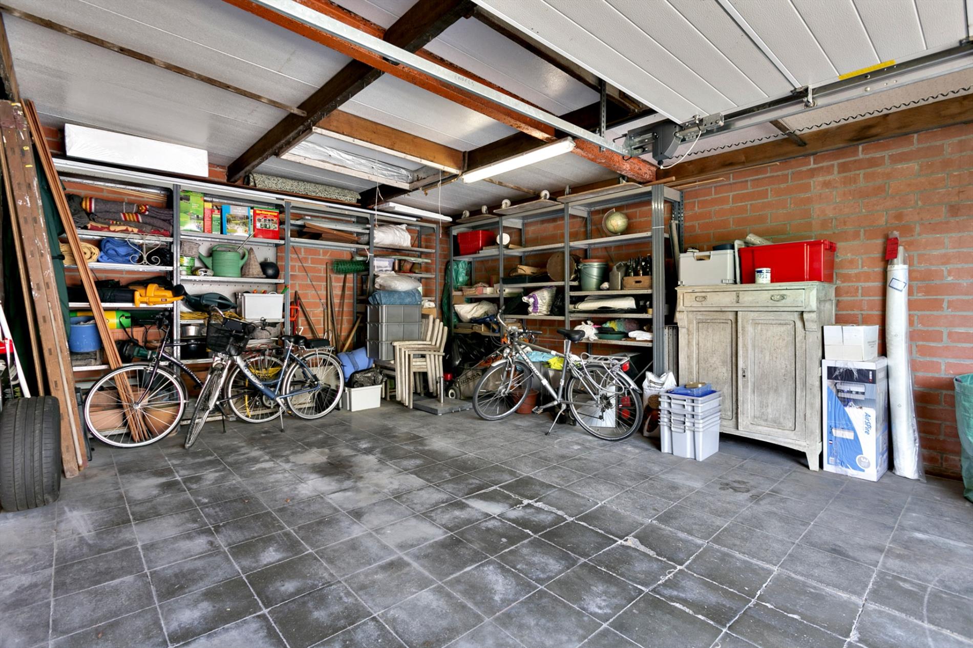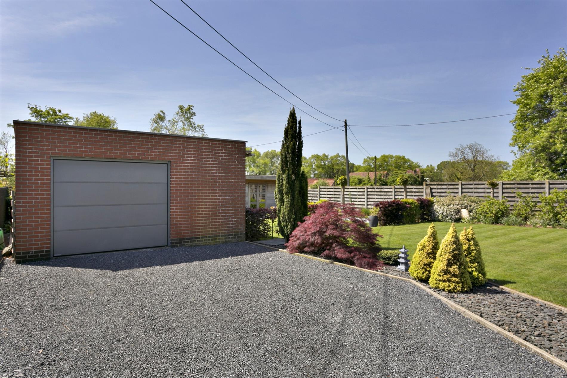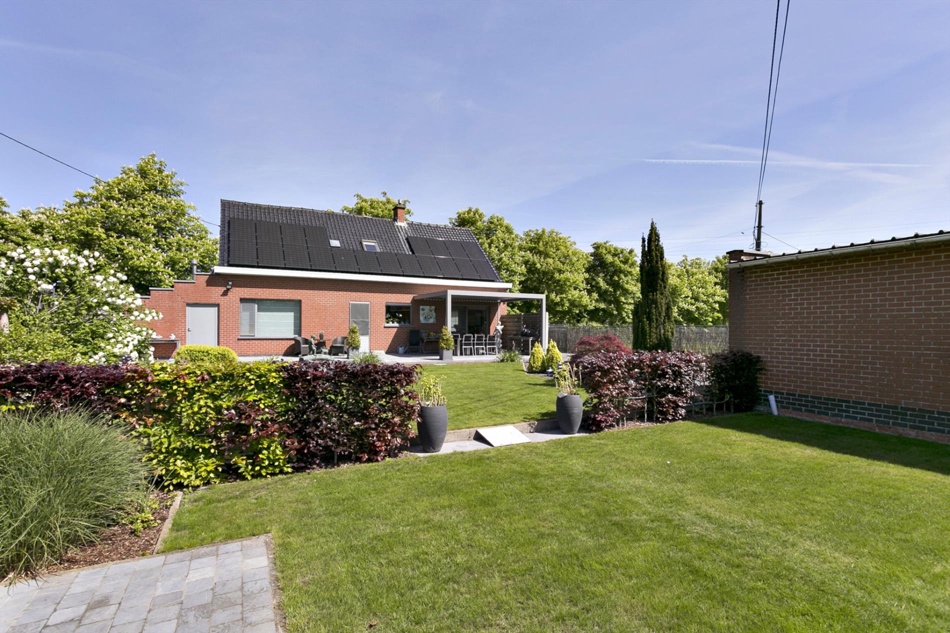 EXTERIEUR: groot terras (deels overdekt, toegang via woonkamer) - mooi aangelegde én onderhoudsvriendelijke tuin (ZUID gericht) - ruime garage (40 m², met automatische poort) - praktisch tuinhuis (12 m²) - oprit voor meerdere auto's.