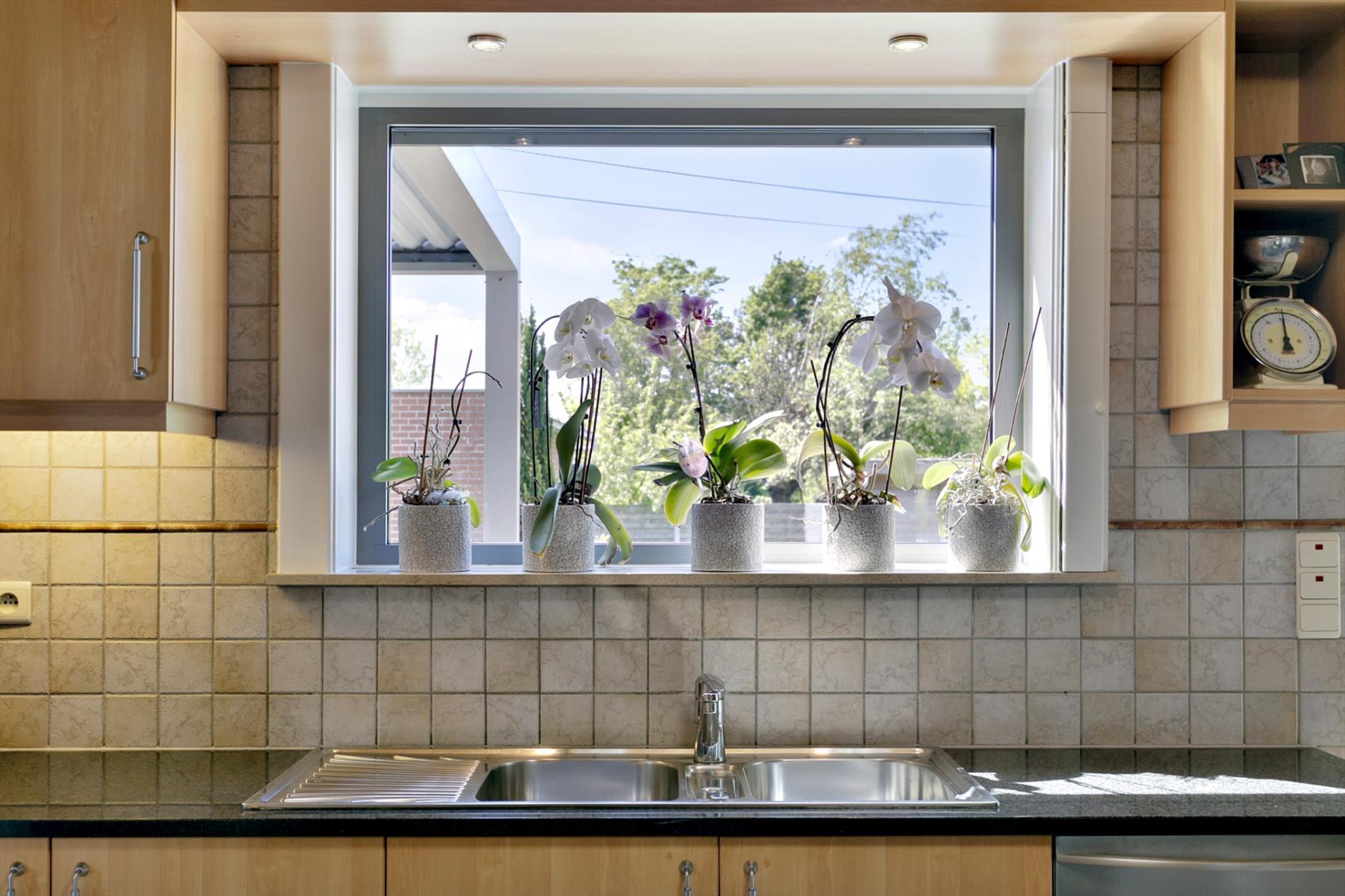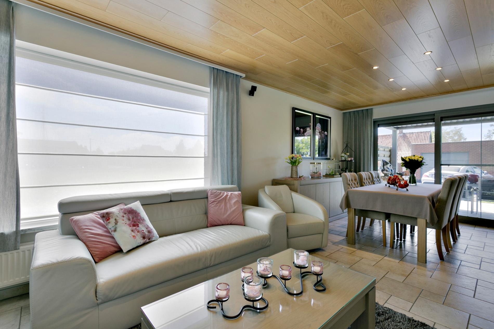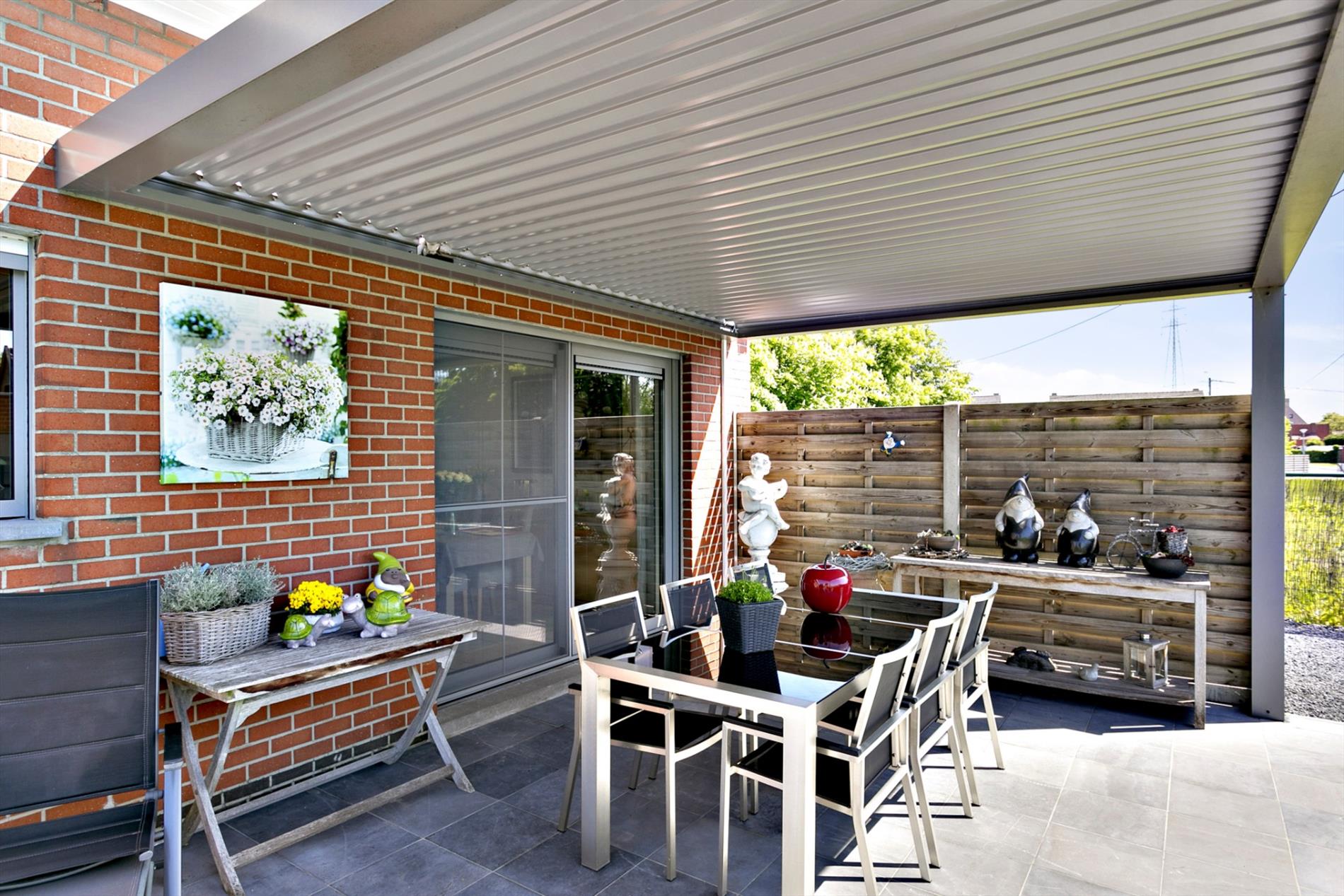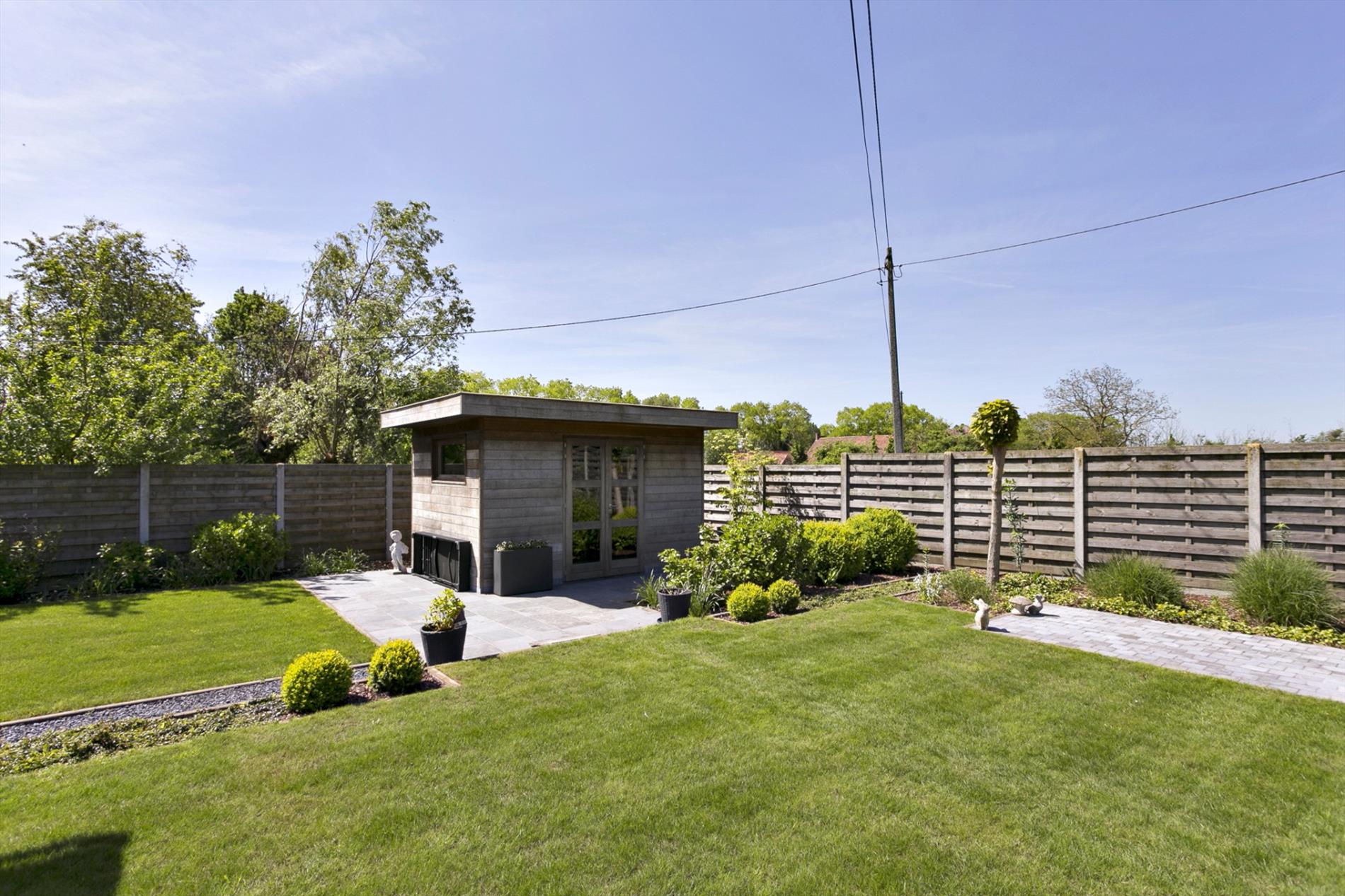 EXTERIEUR: groot terras (deels overdekt, toegang via woonkamer) - mooi aangelegde én onderhoudsvriendelijke tuin (ZUID gericht) - ruime garage (40 m², met automatische poort) - praktisch tuinhuis (12 m²) - oprit voor meerdere auto's.